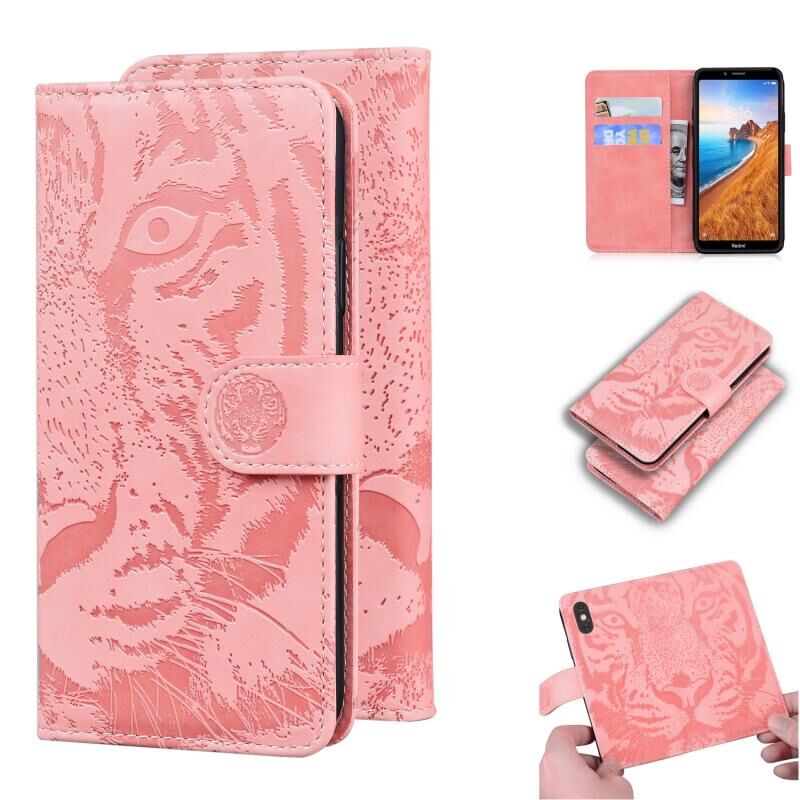 Θήκη δέρματος οριζόντιας αναδίπλωσης με ανάγλυφο σχέδιο τίγρης για Xiaomi Redmi 7A με βάση στήριξης & υποδοχές καρτών & πορτοφόλι (Ροζ)