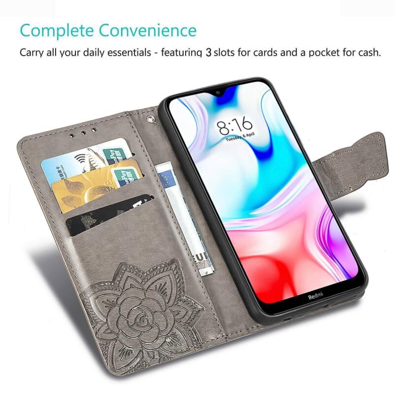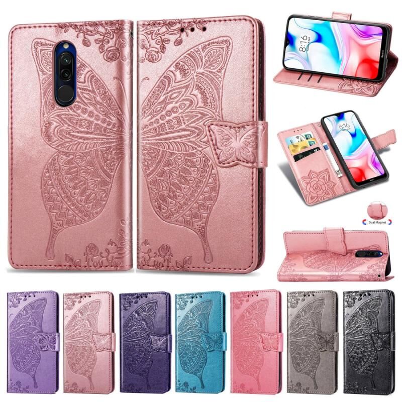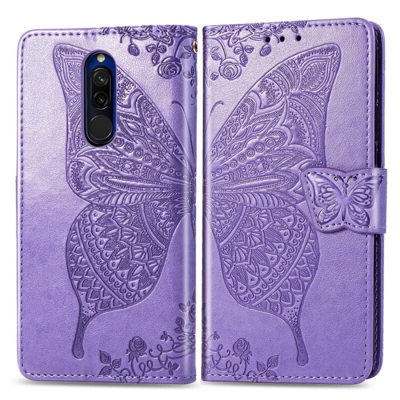 Θήκη για Xiaomi Redmi 8, με σχέδιο πεταλούδας, λουλουδιών, ανάγλυφο, οριζόντια, από δέρμα με βάση στήριξης, κορδόνι και θήκη για κάρτες (ανοιχτό μωβ)