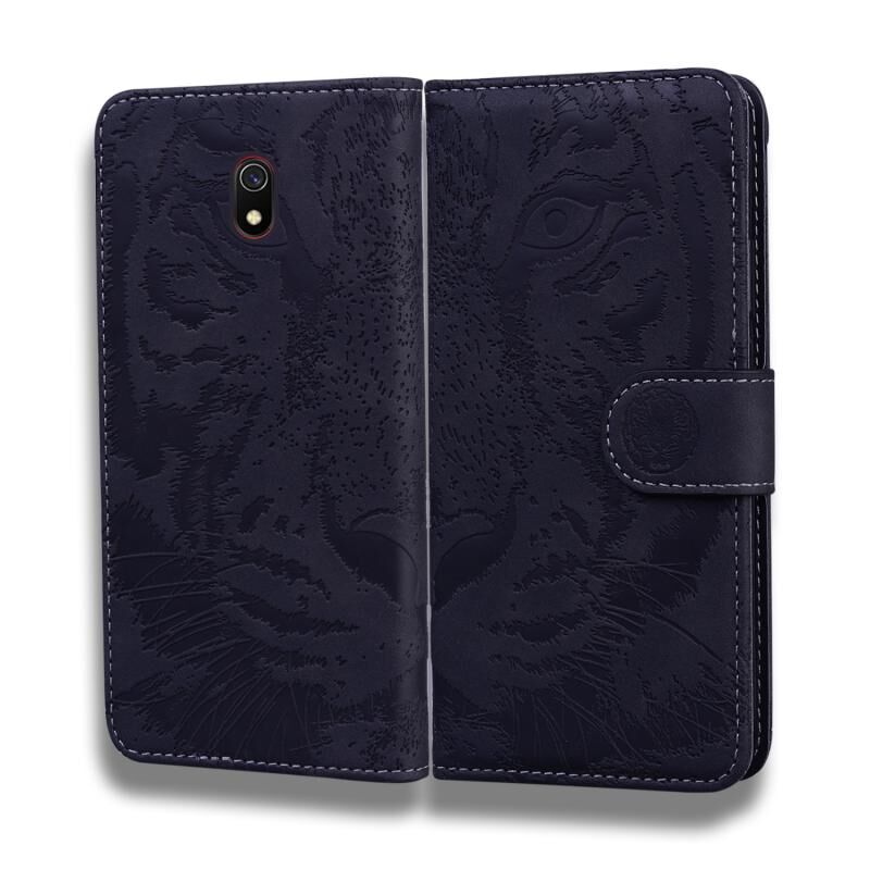 Θήκη δέρματος οριζόντιας αναδίπλωσης με ανάγλυφο σχέδιο Tiger για Xiaomi Redmi 8A με βάση στήριξης & υποδοχές καρτών & πορτοφόλι (Μαύρο)