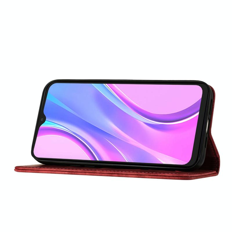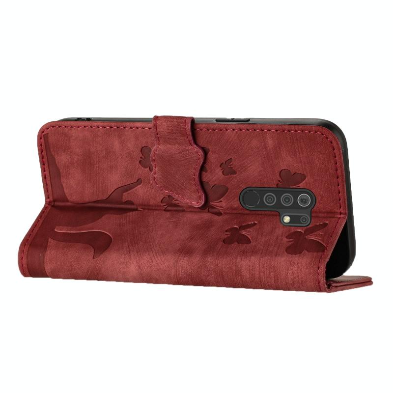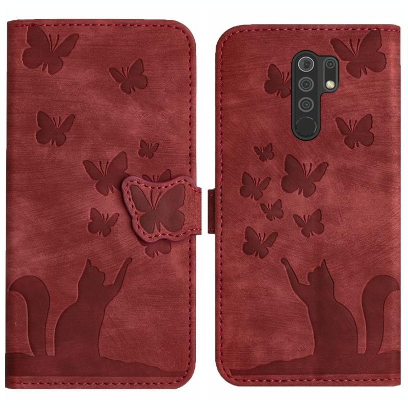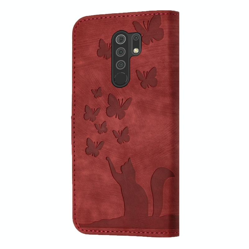 Θήκη βιβλίου δερμάτινη με ανάγλυφο σχέδιο γάτας για Xiaomi Redmi 9 (Κόκκινο)