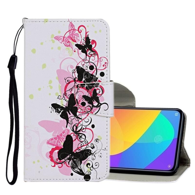 Θήκη δέρματος οριζόντιας αναδίπλωσης με σχέδιο πολύχρωμης ζωγραφικής για Xiaomi Redmi 9 με βάση & υποδοχές καρτών & πορτοφόλι (Τέσσερα Πεταλούδες)