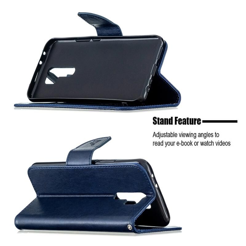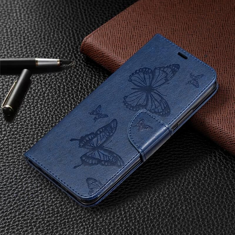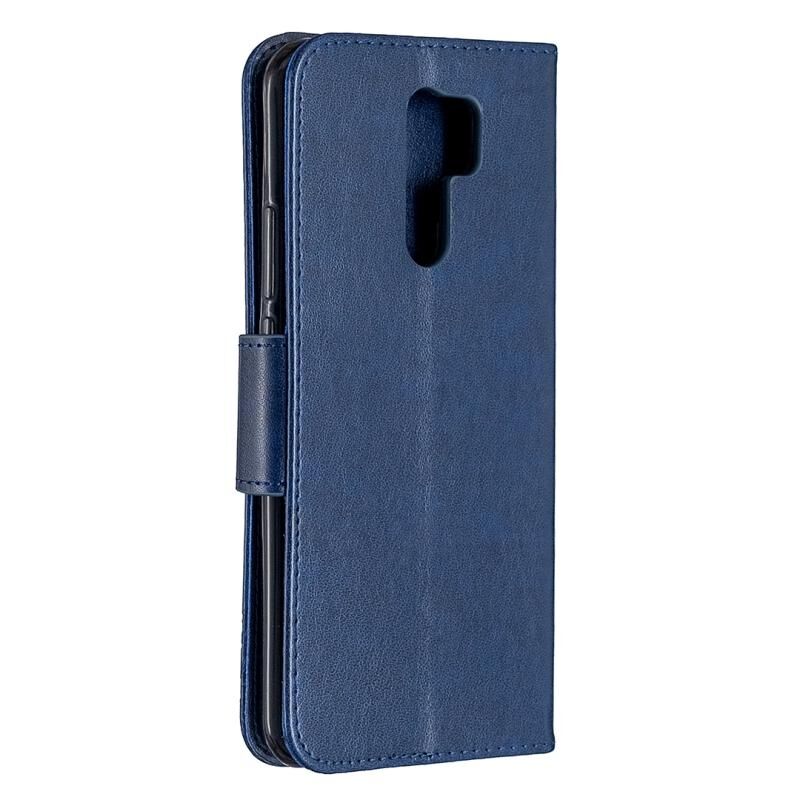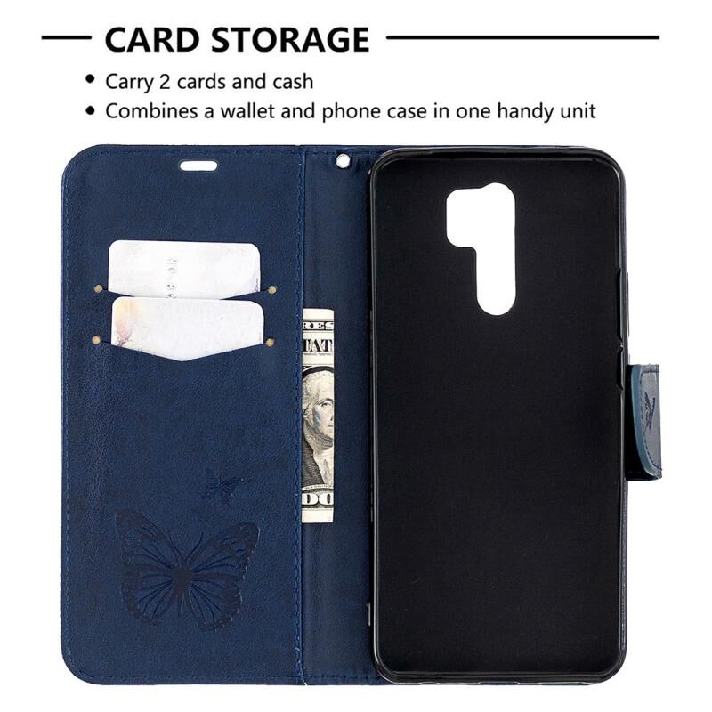 Για Xiaomi Redmi 9 Δύο πεταλούδες ανάγλυφο μοτίβο οριζόντια Flip δερμάτινη θήκη με κάτοχο & υποδοχή για κάρτες & πορτοφόλι & κορδόνι (σκούρο μπλε)