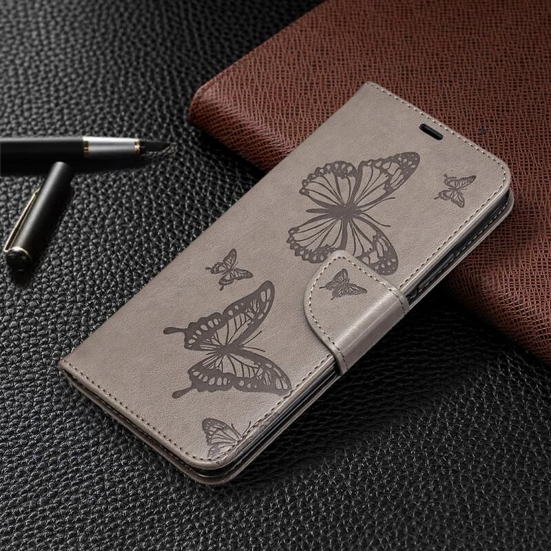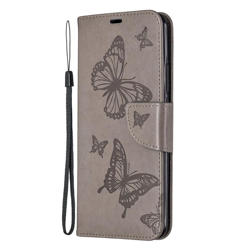 Για Xiaomi Redmi 9 Δύο πεταλούδες ανάγλυφο μοτίβο οριζόντια Flip δερμάτινη θήκη με κάτοχο & υποδοχή για κάρτες & πορτοφόλι & κορδόνι (γκρι)
