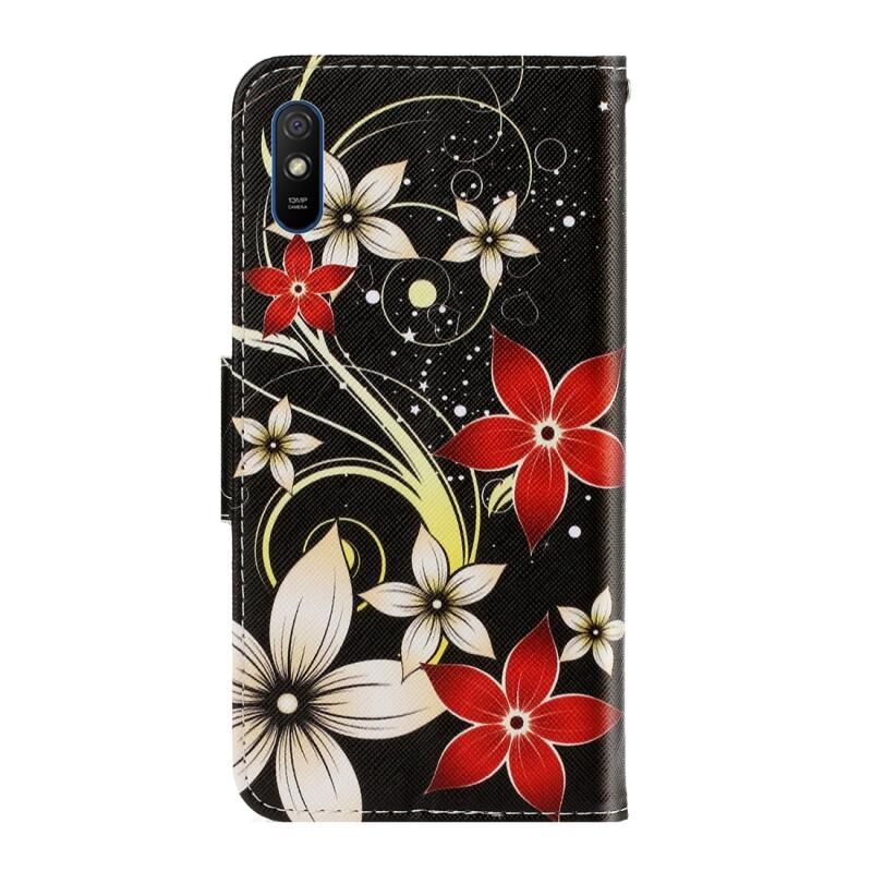 Θήκη για Xiaomi Redmi 9A 3D με έγχρωμο σχέδιο, οριζόντια αναδίπλωση από δερματίνη PU με βάση στήριξης & θήκες για κάρτες & πορτοφόλι (Κόκκινο Λουλούδι)