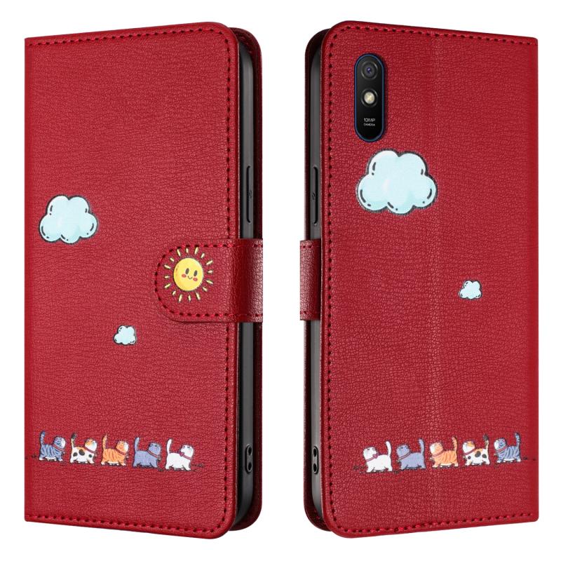 For Xiaomi Redmi 9A Cartoon Cats Leather Phone Case(Red)