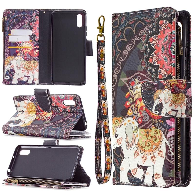 Θήκη για Xiaomi Redmi 9A με σχέδιο πολύχρωμης ζωγραφικής, οριζόντια, δερμάτινη με φερμουάρ, με βάση & θήκες για κάρτες & πορτοφόλι (Λουλούδια Ελέφαντες)