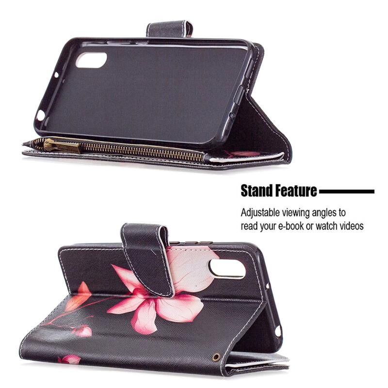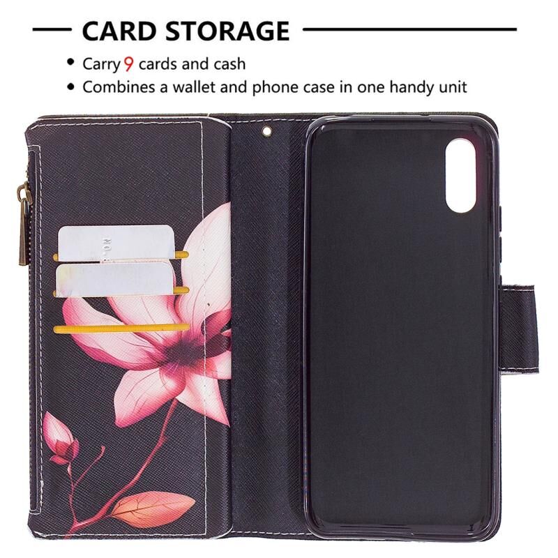 Θήκη δέρματος οριζόντιας αναδίπλωσης με φερμουάρ και σχέδια για Xiaomi Redmi 9A, με βάση για κάρτες και πορτοφόλι (Λωτός)