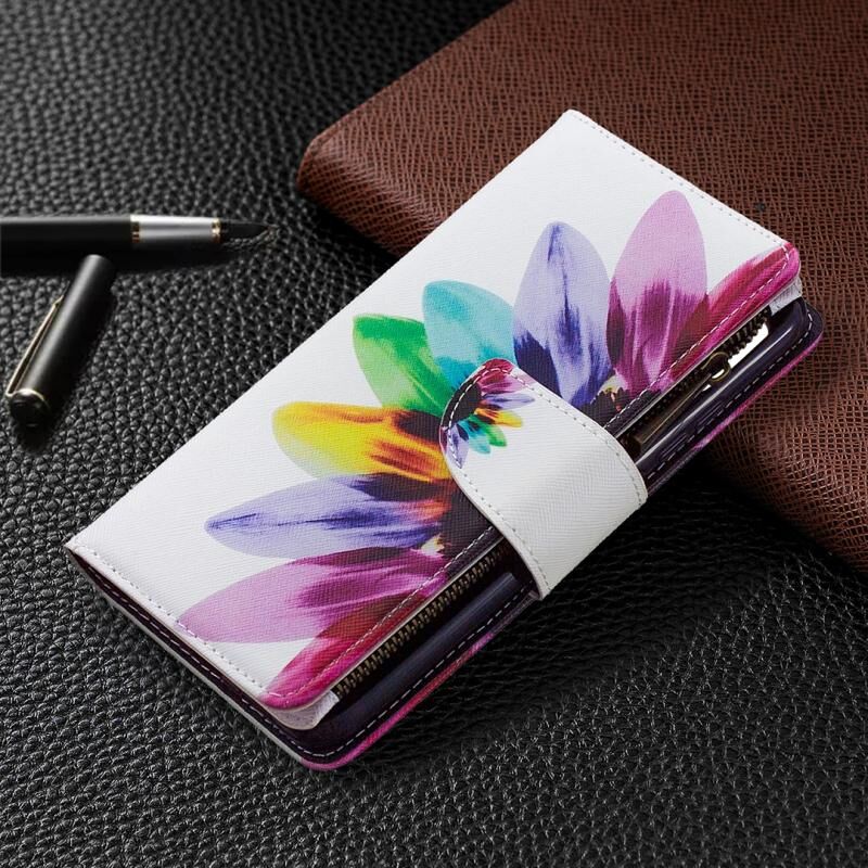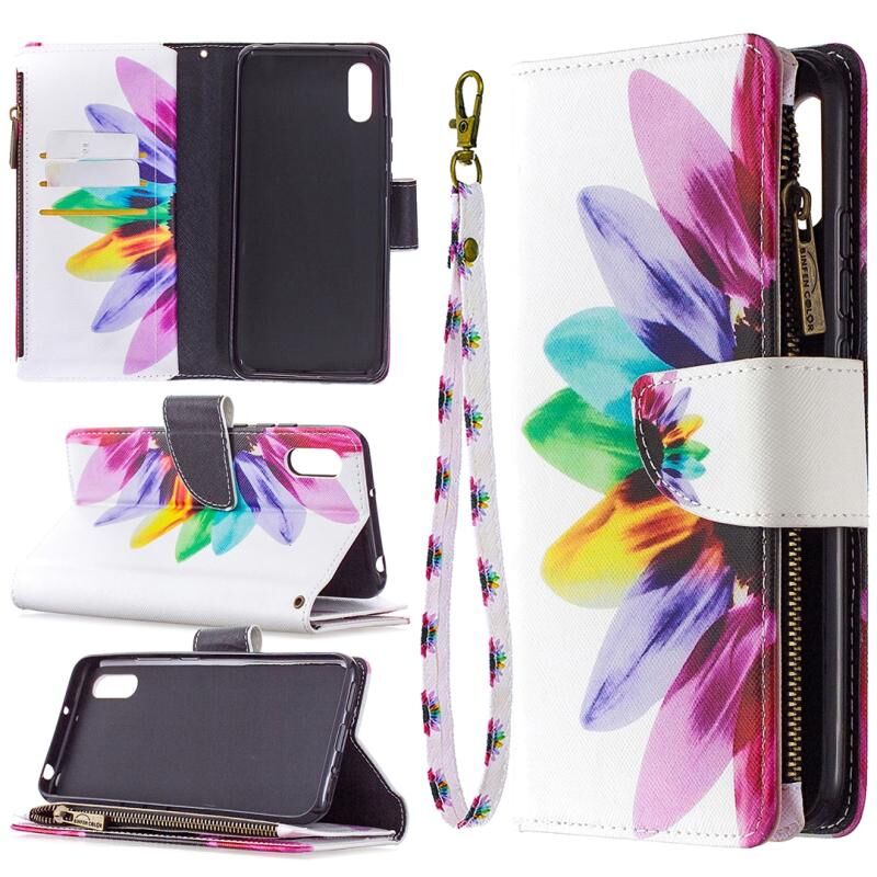 Θήκη για Xiaomi Redmi 9A με έγχρωμο σχέδιο, οριζόντια, δερμάτινη με φερμουάρ, βάση στήριξης & θήκες για κάρτες & πορτοφόλι (Ηλίανθος)