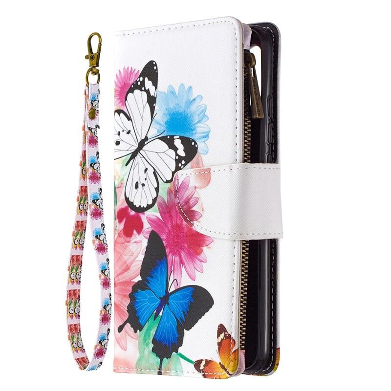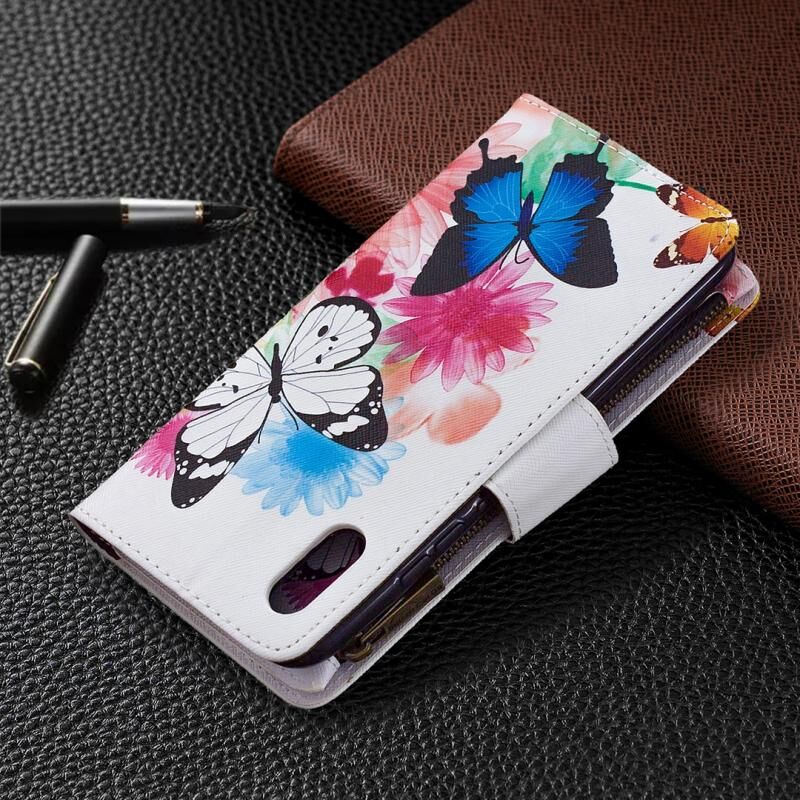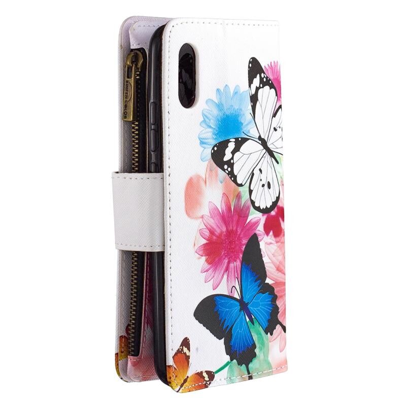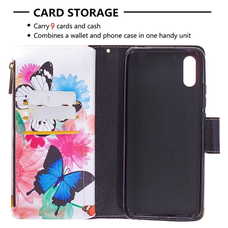 Θήκη για Xiaomi Redmi 9A με σχέδιο ζωγραφικής, χρώματα, οριζόντια αναδιπλούμενη από δέρμα με φερμουάρ, βάση στήριξης & θήκες για κάρτες & πορτοφόλι (Δύο Πεταλούδες)