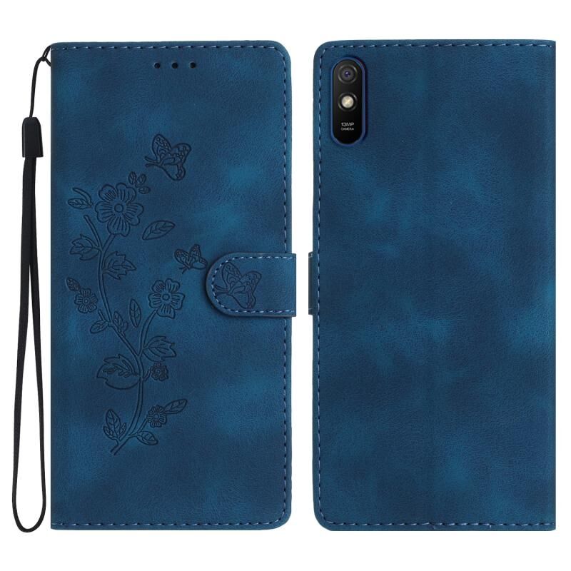 Για Xiaomi Redmi 9A λουλούδι πεταλούδα ανάγλυφο μοτίβο δερμάτινη θήκη τηλεφώνου (μπλε)