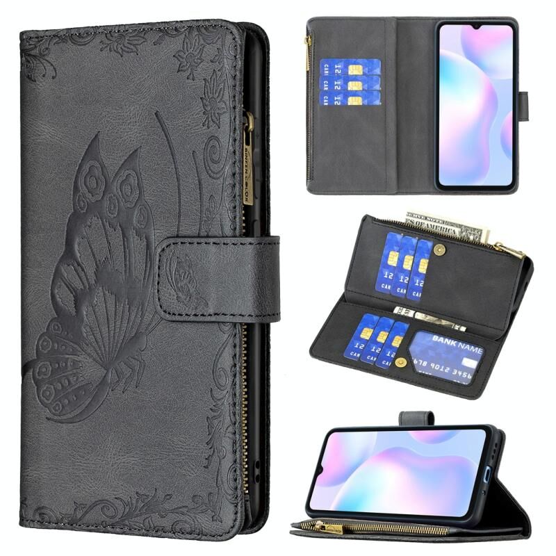 Για Xiaomi Redmi 9A Πετώντας πεταλούδα ανάγλυφο μοτίβο φερμουάρ οριζόντια Flip δερμάτινη θήκη με κάτοχο & υποδοχές καρτών & πορτοφόλι (μαύρο)
