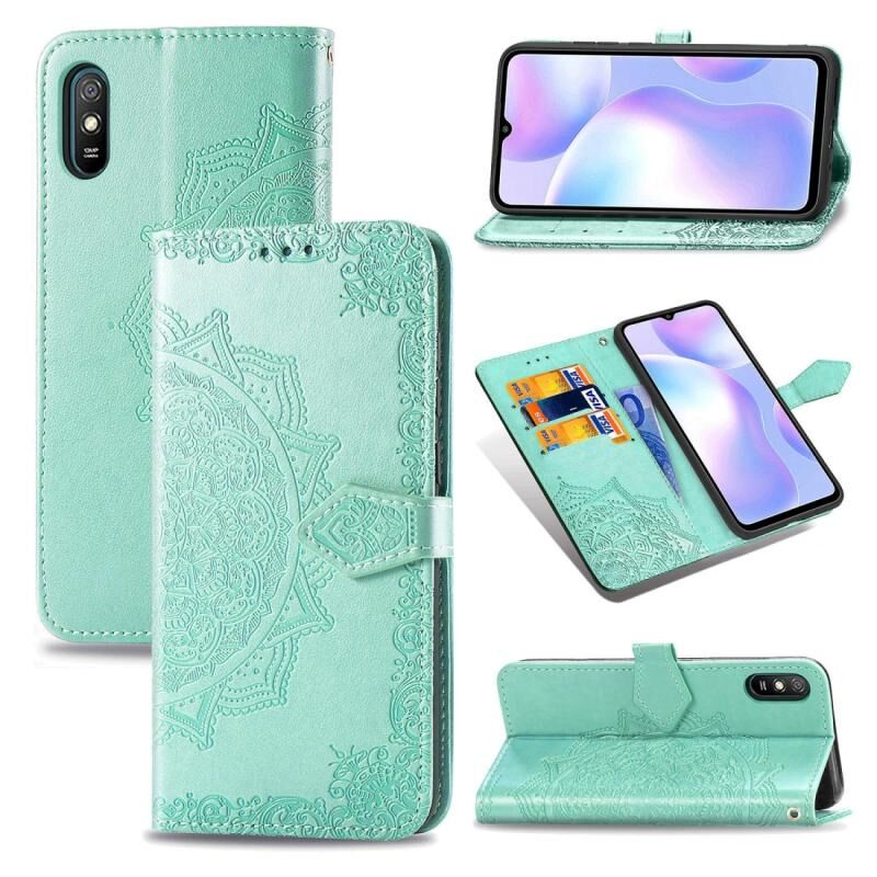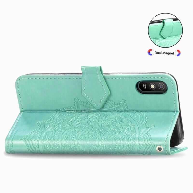 Θήκη δέρματος οριζόντιας αναδίπλωσης για Xiaomi Redmi 9A με σχέδιο Mandala σε ανάγλυφο, με βάση στήριξης, θήκες καρτών, πορτοφόλι και κορδόνι (Χρυσό Ρόδι)