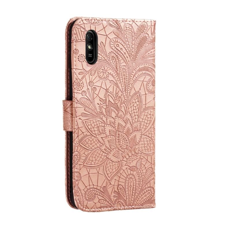 Θήκη για Xiaomi Redmi 9A με δαντελένιο λουλούδι, οριζόντια αναδιπλούμενη από δέρμα με βάση στήριξης & υποδοχές καρτών & πορτοφόλι & κορνίζα φωτογραφιών (Μωβ)