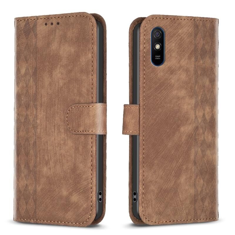 Για Xiaomi Redmi 9A καρό ανάγλυφη δερμάτινη θήκη τηλεφώνου (καφέ)