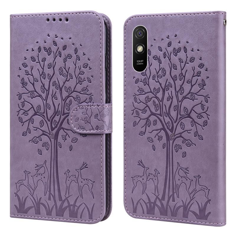 Θήκη τηλεφώνου από δέρμα με σχέδιο δέντρου και ελαφιού, τύπου flip, για Xiaomi Redmi 9A (Μωβ)