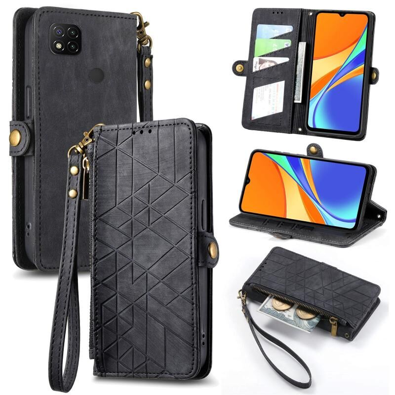Για Xiaomi Redmi 9C γεωμετρική φερμουάρ πορτοφόλι πλευρά πόρπη δερμάτινη θήκη τηλεφώνου (μαύρο)