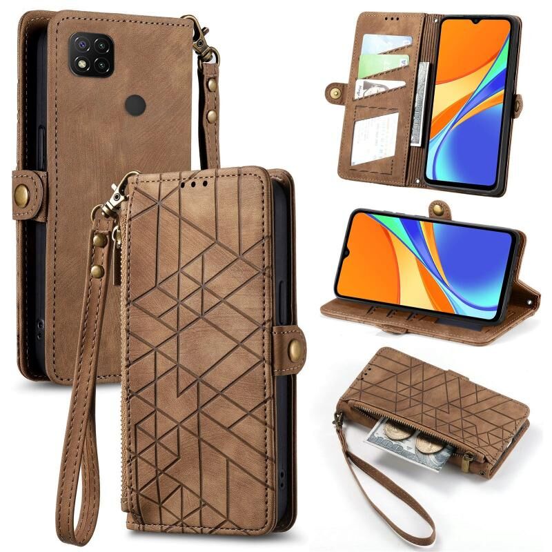 Για Xiaomi Redmi 9C γεωμετρική φερμουάρ πορτοφόλι πλευρά πόρπη δερμάτινη θήκη τηλεφώνου (καφέ)