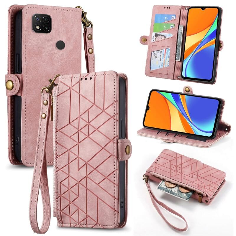 Για Xiaomi Redmi 9C γεωμετρική φερμουάρ πορτοφόλι πλευρά πόρπη δερμάτινη θήκη τηλεφώνου (ροζ)