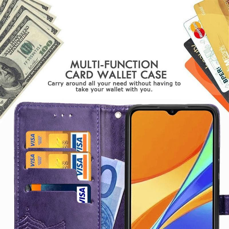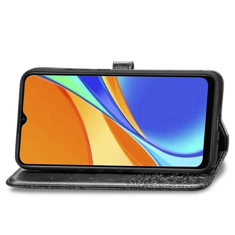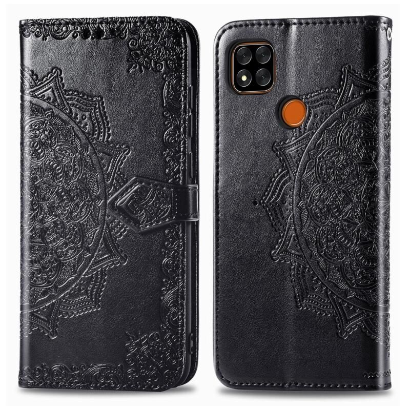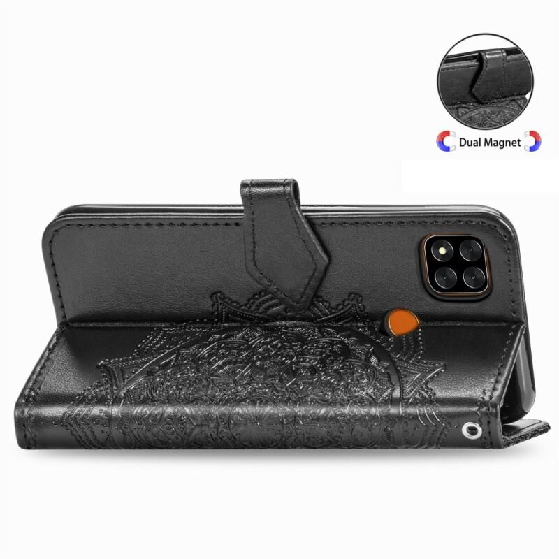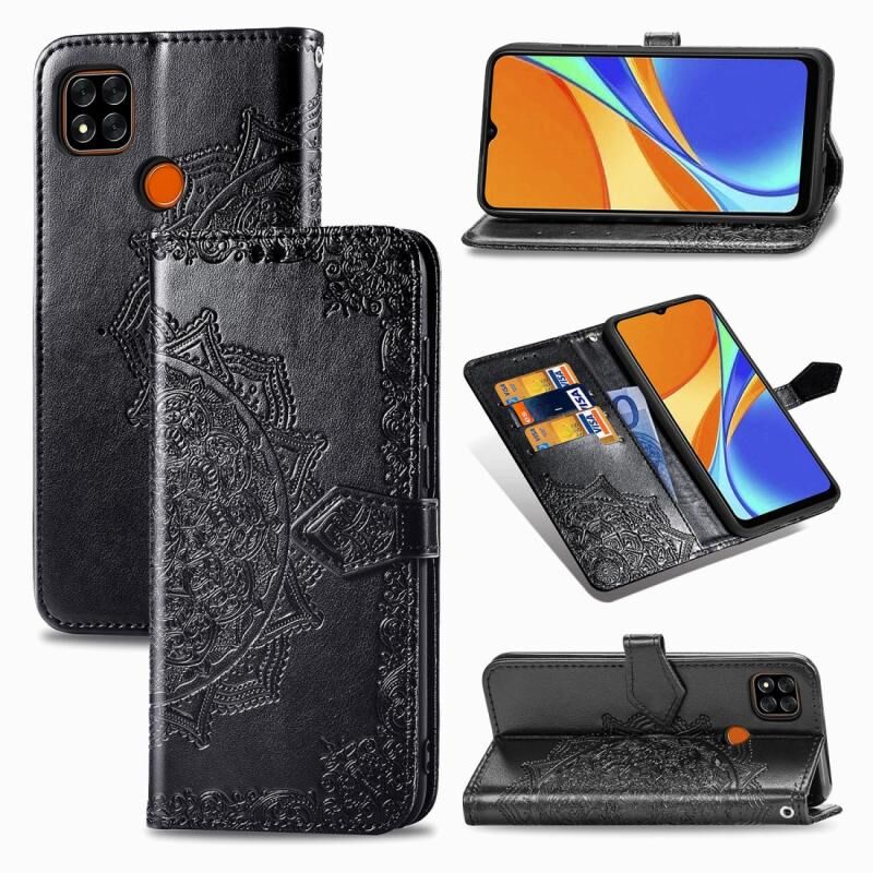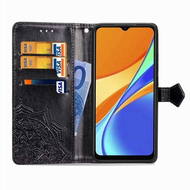 Θήκη δέρματος οριζόντιας αναδίπλωσης για Xiaomi Redmi 9C με σχέδιο Mandala σε ανάγλυφο, με βάση στήριξης, θήκες καρτών, πορτοφόλι και κορδόνι (Μαύρο)