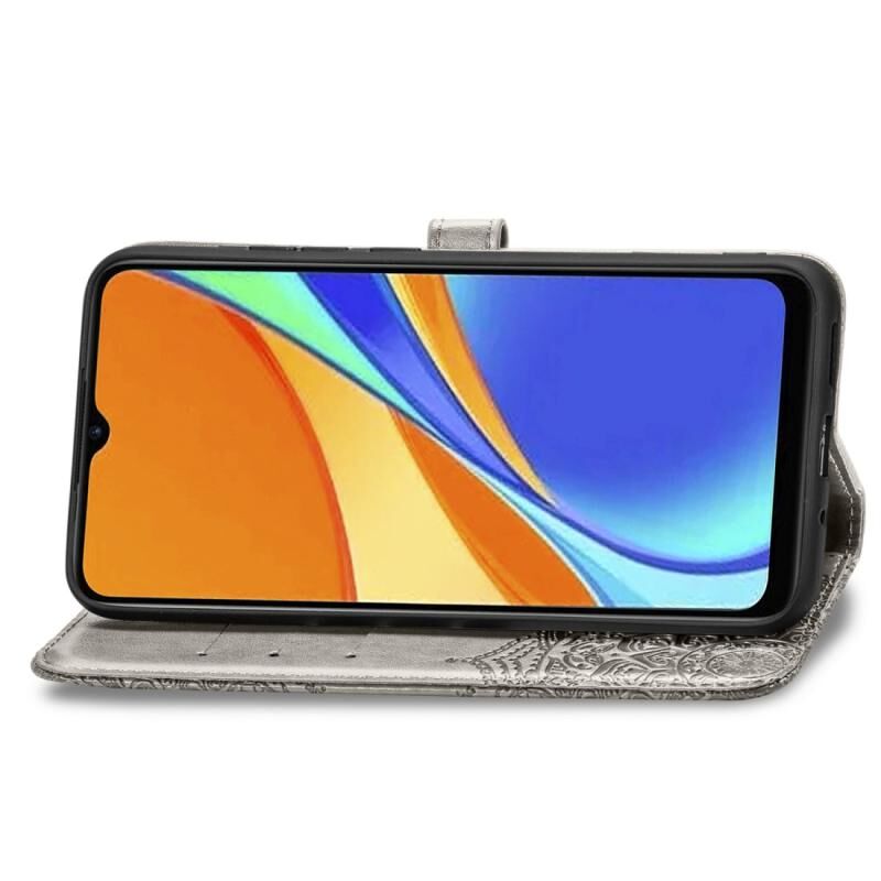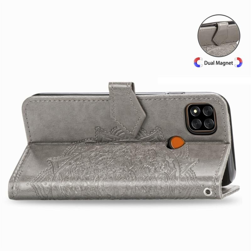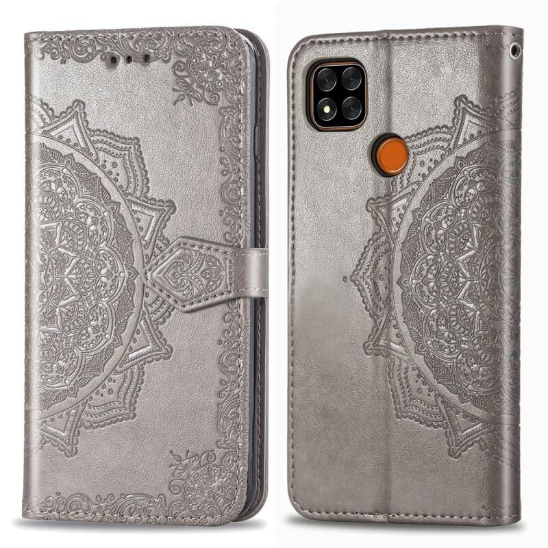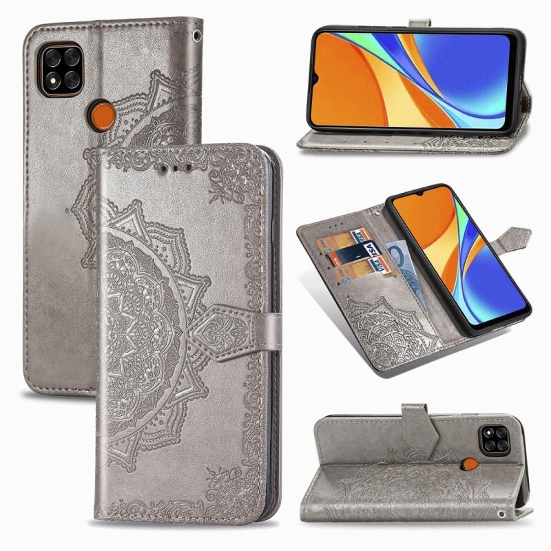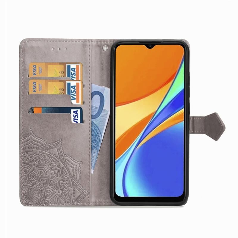 Θήκη δέρματος οριζόντιας αναδίπλωσης για Xiaomi Redmi 9C με σχέδιο Mandala σε ανάγλυφο, με βάση στήριξης, θήκες καρτών, πορτοφόλι και κορδόνι (Μαύρο)
