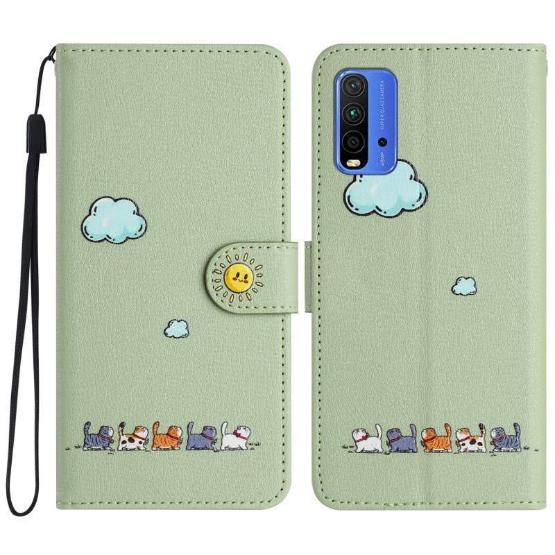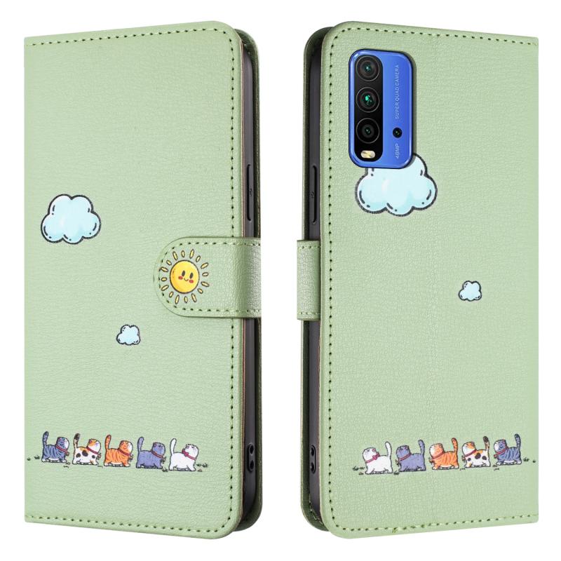 For Xiaomi Redmi 9T Cartoon Cats Leather Phone Case(Green)