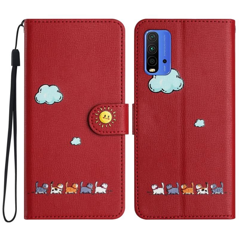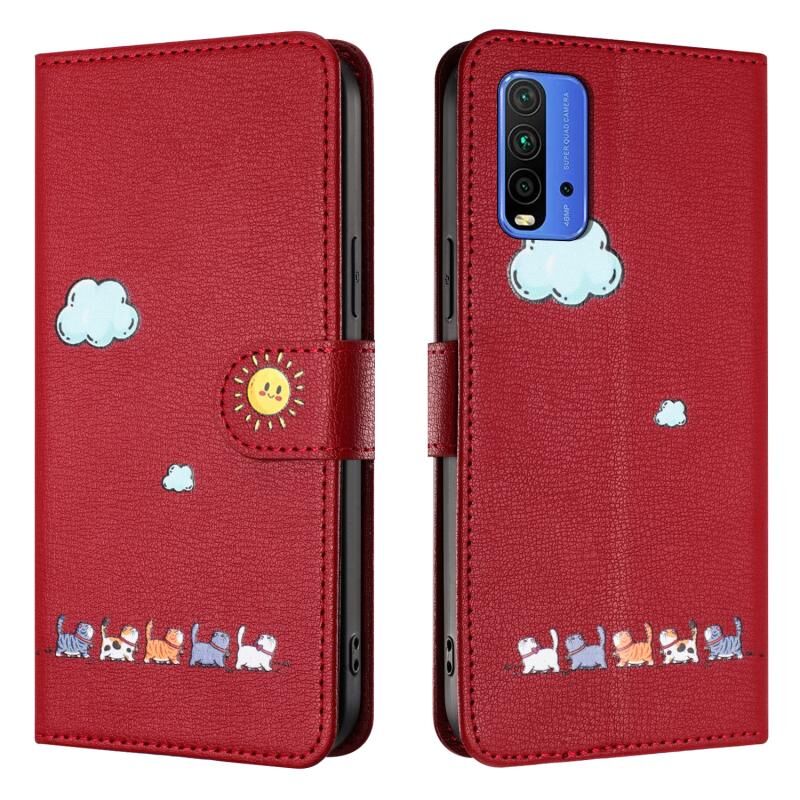 Θήκη τηλεφώνου δερμάτινη με σχέδια γάτας για Xiaomi Redmi 9T (Κόκκινο)