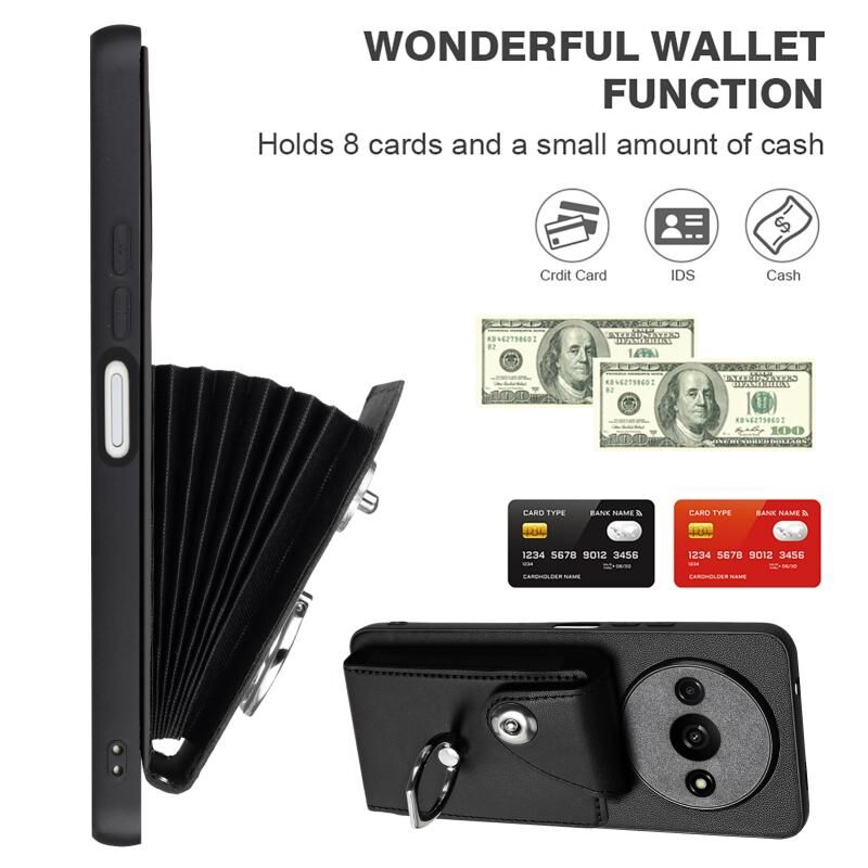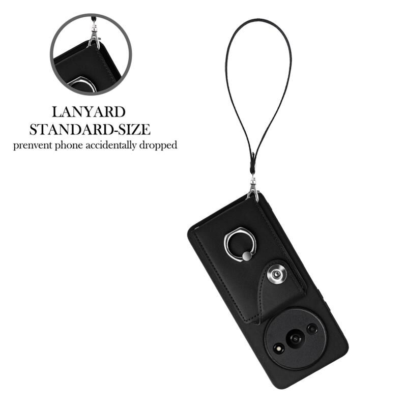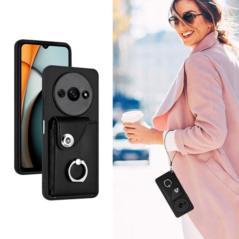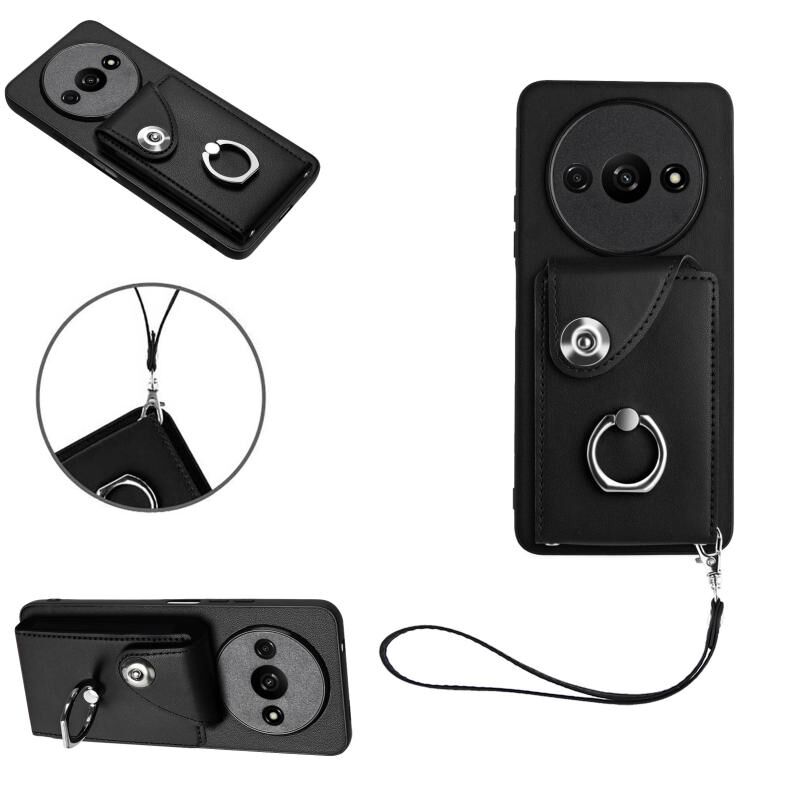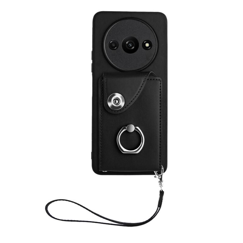 Για Xiaomi Redmi A3 4G Οργανική κάρτα τσάντα τσάντα δαχτυλίδι κάτοχος PU υπόθεση τηλεφώνου με κορδόνι (Μαύρο)