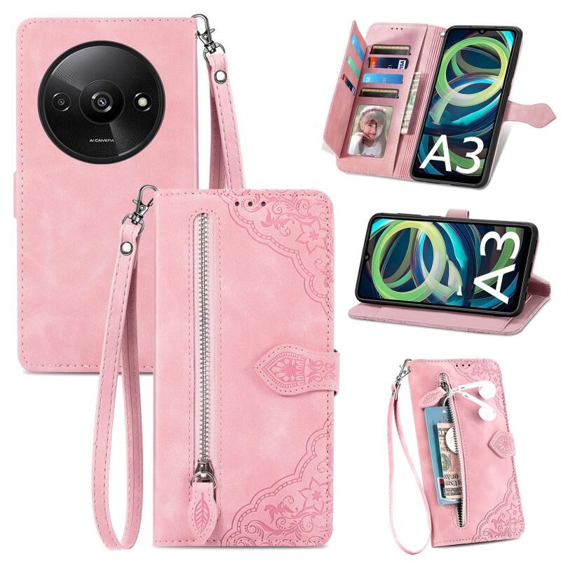 Για Xiaomi Redmi A3 ανάγλυφο λουλούδι φερμουάρ δερμάτινη θήκη τηλεφώνου (ροζ)