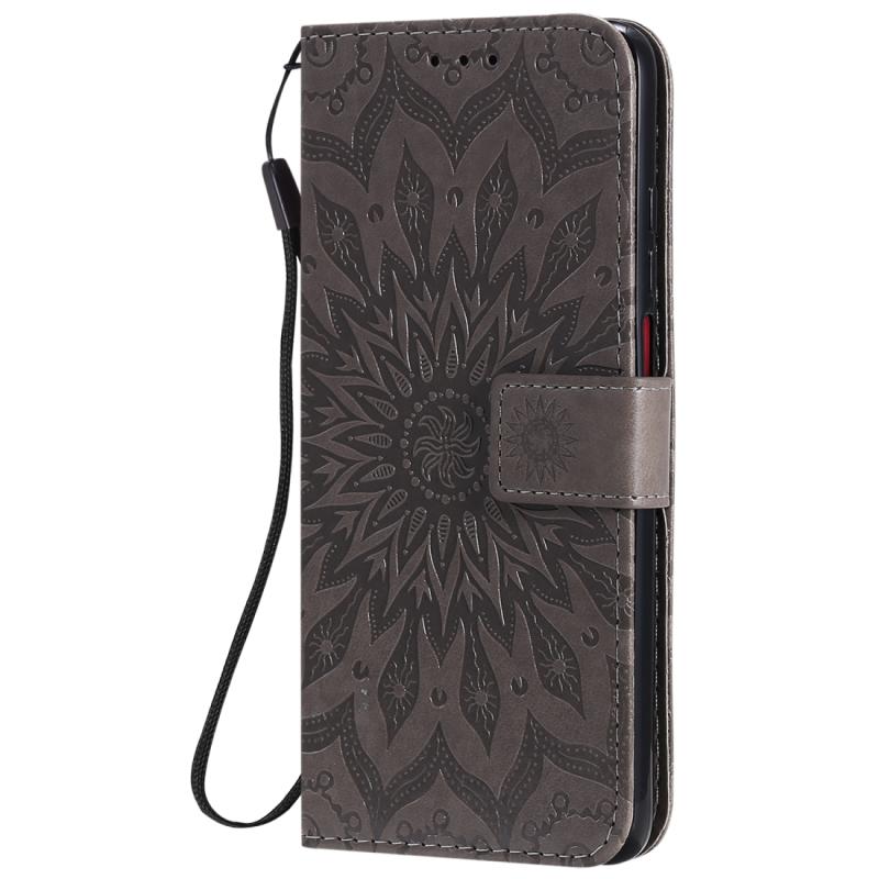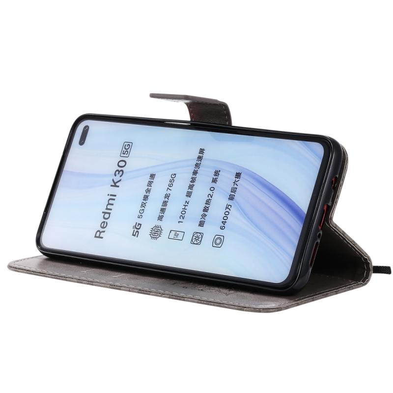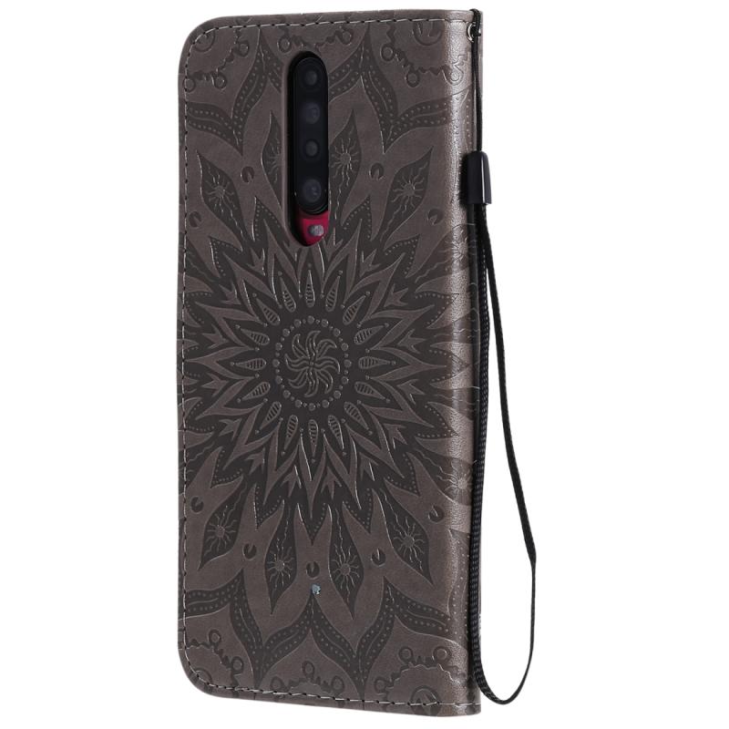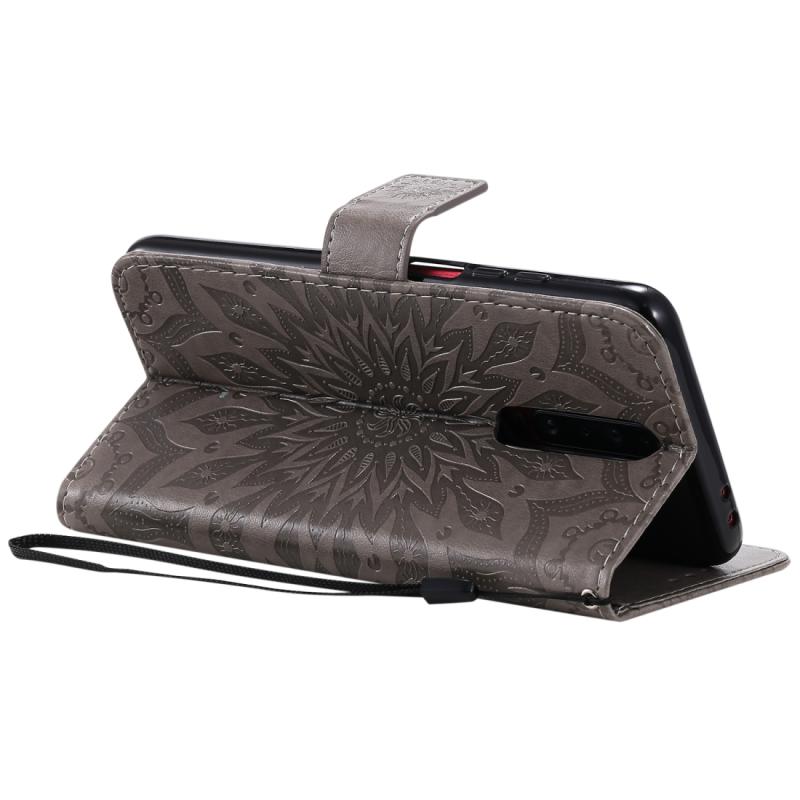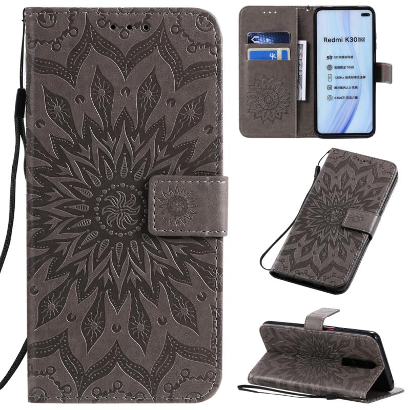For Xiaomi Redmi K30 Pressed Printing Sunflower Pattern Horizontal Flip PU Leather Case with Holder & Card Slots & Wallet & Lanyard(Grey)