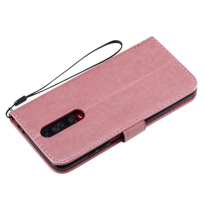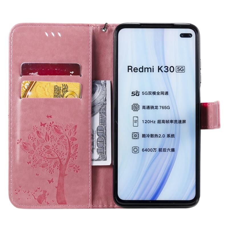 Θήκη για Xiaomi Redmi K30 με σχέδιο Δέντρου & Γάτας, εκτυπωμένη με θερμοτύπωση, οριζόντια αναδιπλούμενη από δερματίνη PU με βάση στήριξης & θήκες για κάρτες & πορτοφόλι & κορδόνι (ρόζ)
