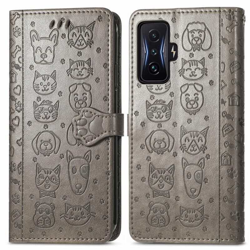 Θήκη τηλεφώνου από δέρμα με ανάγλυφα σχέδια χαριτωμένων γάτας και σκύλου για Xiaomi Redmi K50 Gaming (Γκρι)