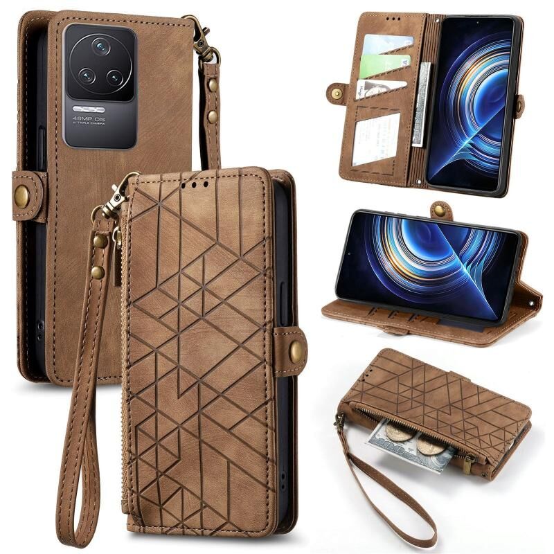 Για Xiaomi Redmi K50 γεωμετρική φερμουάρ πορτοφόλι πλευρά πόρπη δερμάτινη θήκη τηλεφώνου (καφέ)