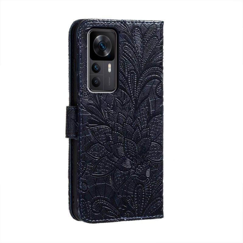 Για Xiaomi Redmi K50 Ultra Lace λουλούδι ανάγλυφο Flip δέρμα τηλέφωνο υπόθεση (σκούρο μπλε)