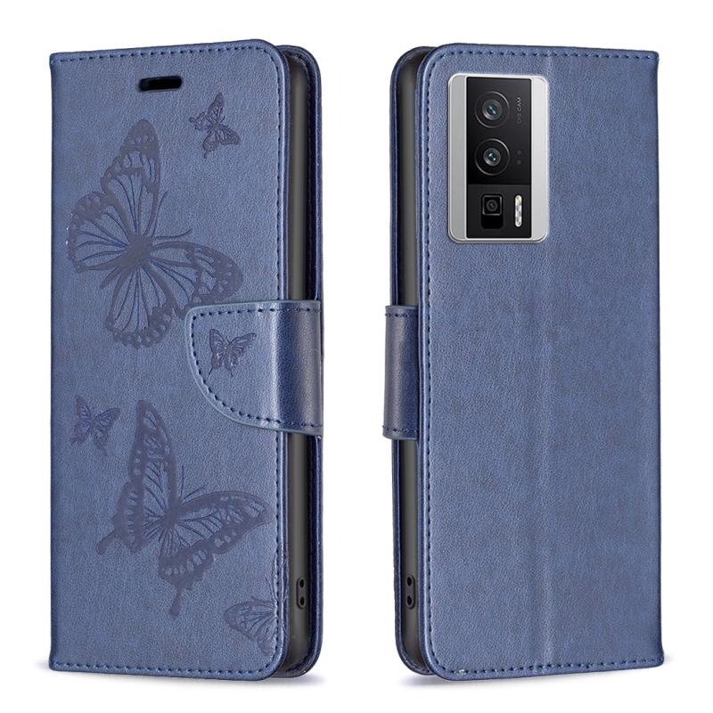 Θήκη τηλεφώνου δερμάτινη με ανάγλυφο σχέδιο δύο πεταλούδων για Xiaomi Redmi K60 / K60 Pro (Μπλε)