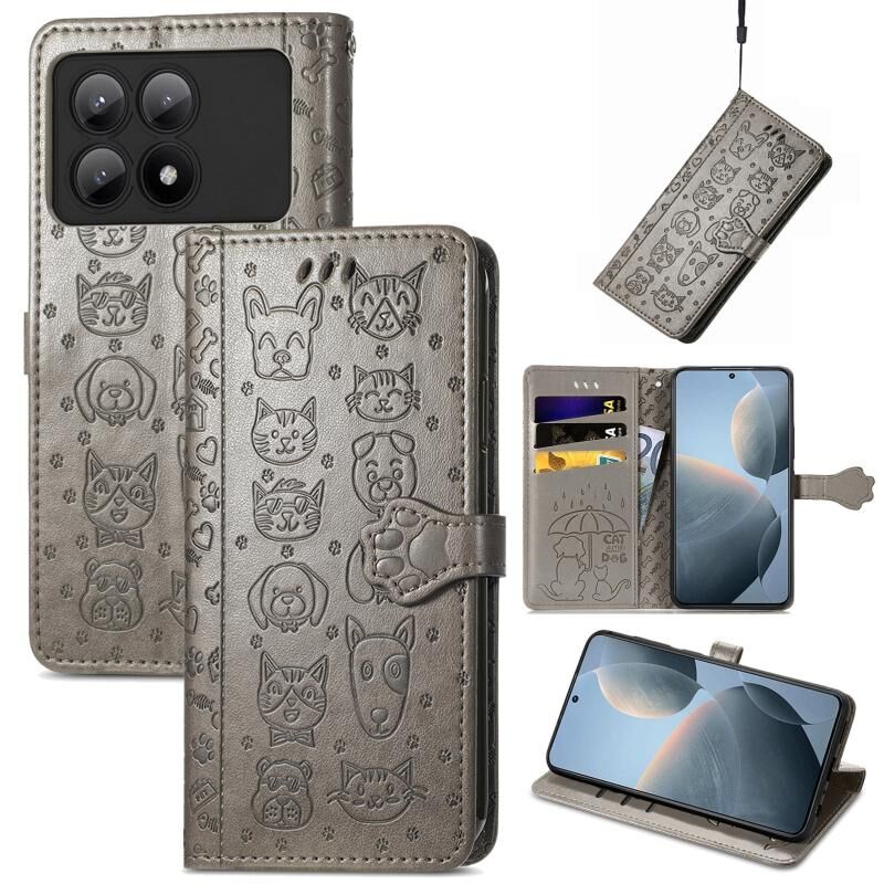 For Xiaomi Redmi K70E Cat and Dog Embossed Leather Phone Case(Grey)
