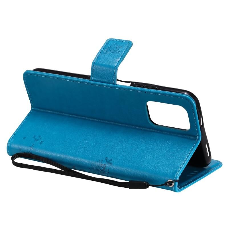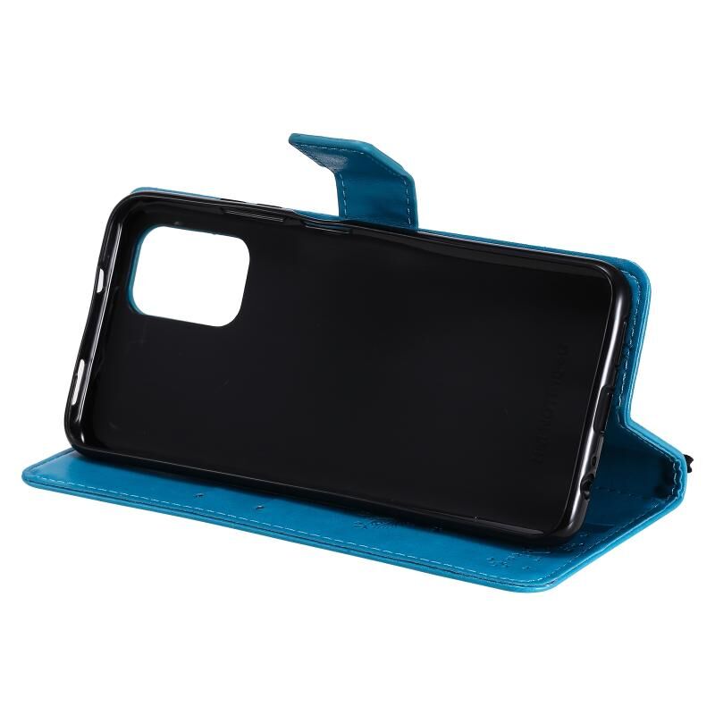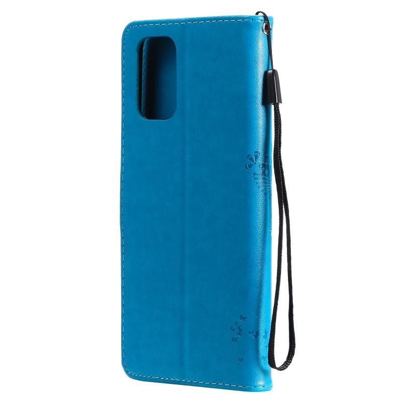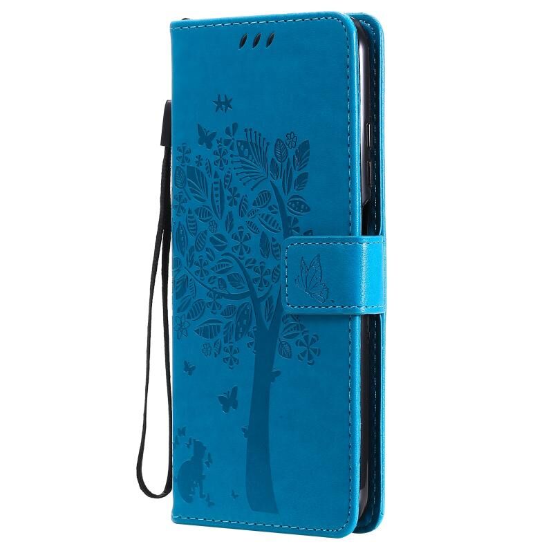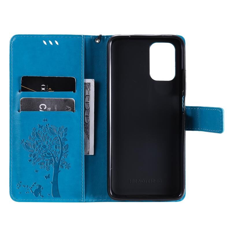 For Xiaomi Redmi Note 10 4G Tree & Cat Pattern Pressed Printing Horizontal Flip PU Leather Case with Holder & Card Slots & Wallet & Lanyard(Blue)