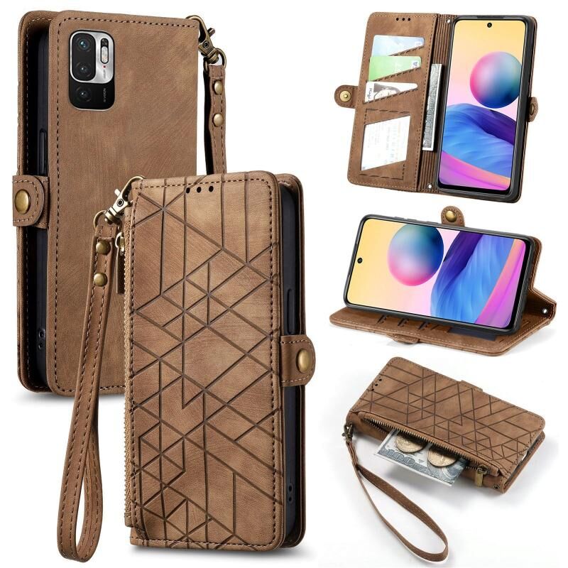 Για Xiaomi Redmi Σημείωση 10 5G γεωμετρική φερμουάρ πορτοφόλι πλευρά πόρπη δερμάτινη θήκη τηλεφώνου (καφέ)