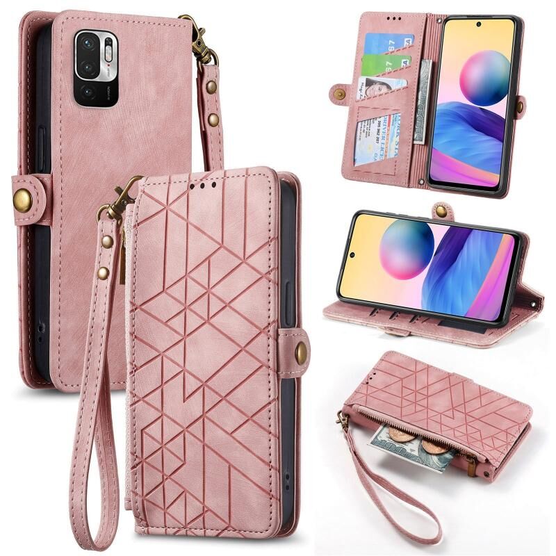 Για Xiaomi Redmi Σημείωση 10 5G γεωμετρική φερμουάρ πορτοφόλι πλευρά πόρπη δερμάτινη θήκη τηλεφώνου (ρόζ)
