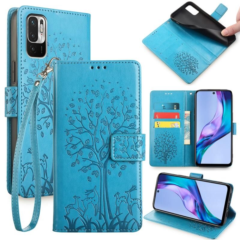 Θήκη τηλεφώνου δερμάτινη ανάγλυφη με σχέδιο δέντρου και ελαφιού για Xiaomi Redmi Note 10 Japan (Μπλε)
