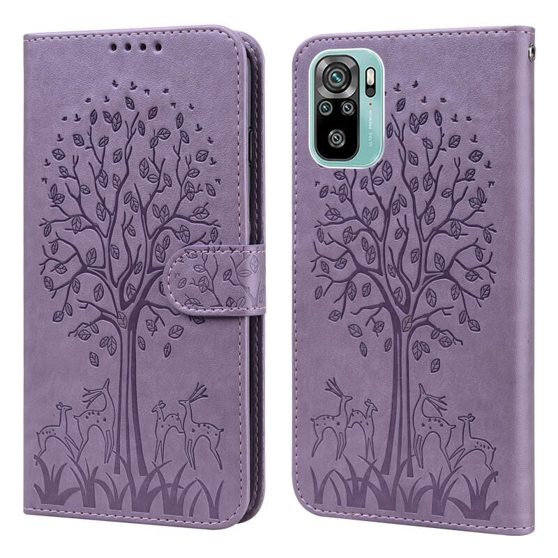 Θήκη τηλεφώνου από δέρμα με σχέδιο δέντρου και ελαφιού, τύπου flip, για Xiaomi Redmi Note 10 / Note 10S (Μωβ)