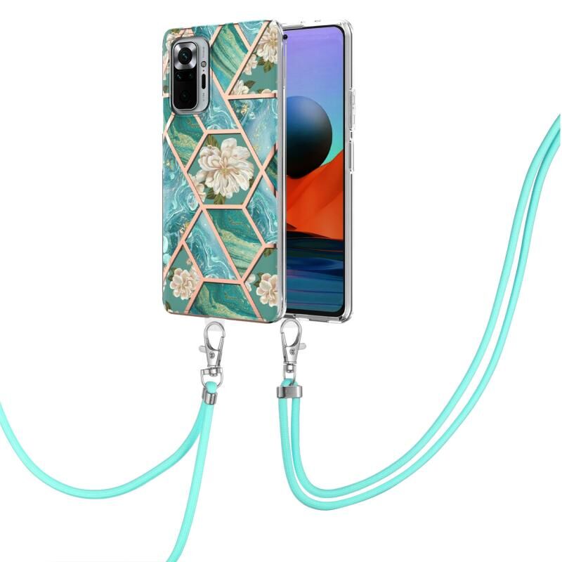 Θήκη προστασίας TPU με ενσωματωμένο κορδόνι για Xiaomi Redmi Note 10 Pro/ 10 Pro Max, με γαλβανισμό, συνδυασμό μαρμάρου και λουλουδιών, αντι-κραδασμική (Μπλε λουλούδι)