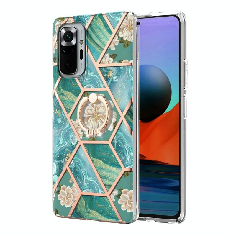 Θήκη προστασίας TPU με ενσωματωμένη βάση δακτυλιδιού με ρητίνες, αντικραδασμική, για Xiaomi Redmi Note 10 Pro Max, με γαλβανισμένο σχέδιο μαρμάρου και λουλουδιών (Ροζ Λουλούδι).