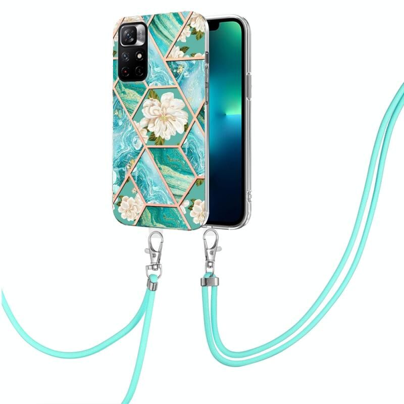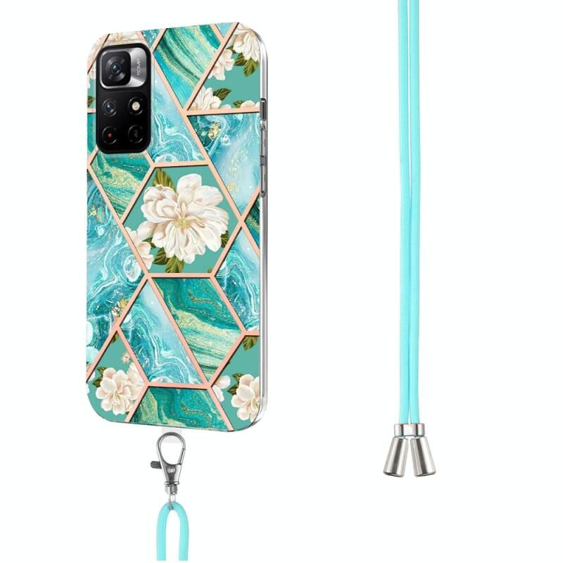 Θήκη τηλεφώνου TPU με κορδόνι για Xiaomi Redmi Note 11 5G, κινέζικο patchwork με σχέδιο μαρμάρινου λουλουδιού (Μπλε λουλούδι)