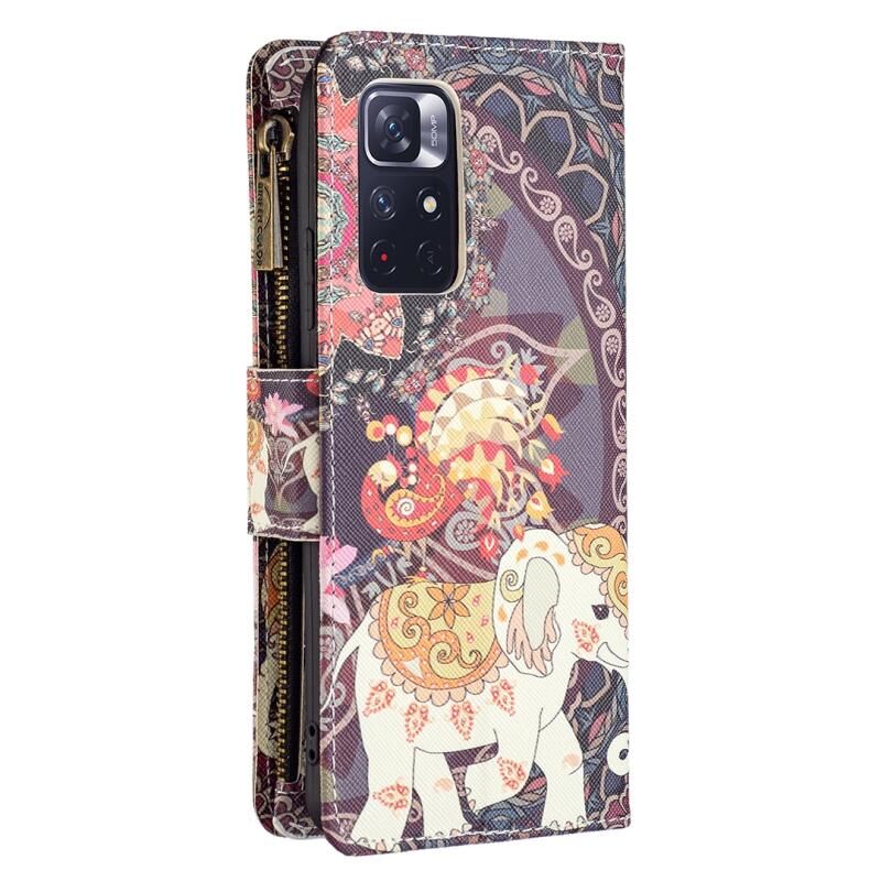 Θήκη τηλεφώνου από δέρμα με φερμουάρ και πολύχρωμο σχέδιο για Xiaomi Redmi Note 11 5G (Λουλούδια και Ελέφαντες)