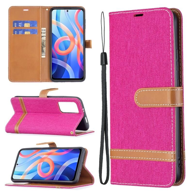 Για Xiaomi Redmi Note 11 5G/Note 11T 5G/Poco M4 Pro 5G Χρώμα Matching Denim Texture Δερμάτινη θήκη τηλεφώνου με θήκη & υποδοχές καρτών & πορτοφόλι & κορδόνι (Ροζέ κόκκινο)