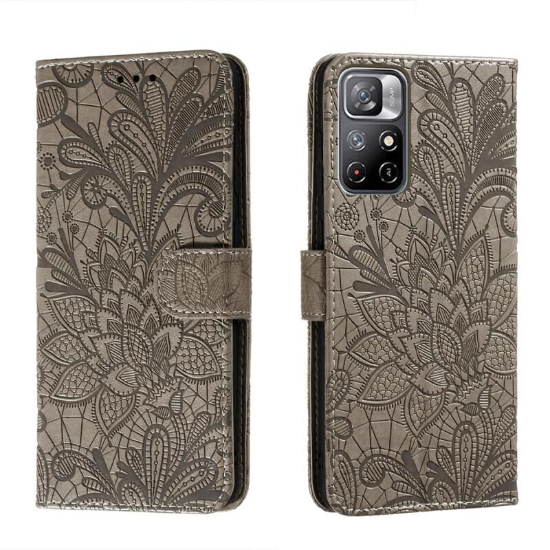 Για Xiaomi Redmi Note 11 Lace Flower Δερμάτινη θήκη τηλεφώνου με θήκη & υποδοχές για κάρτες & πορτοφόλι & πλαίσιο φωτογραφιών (γκρι)