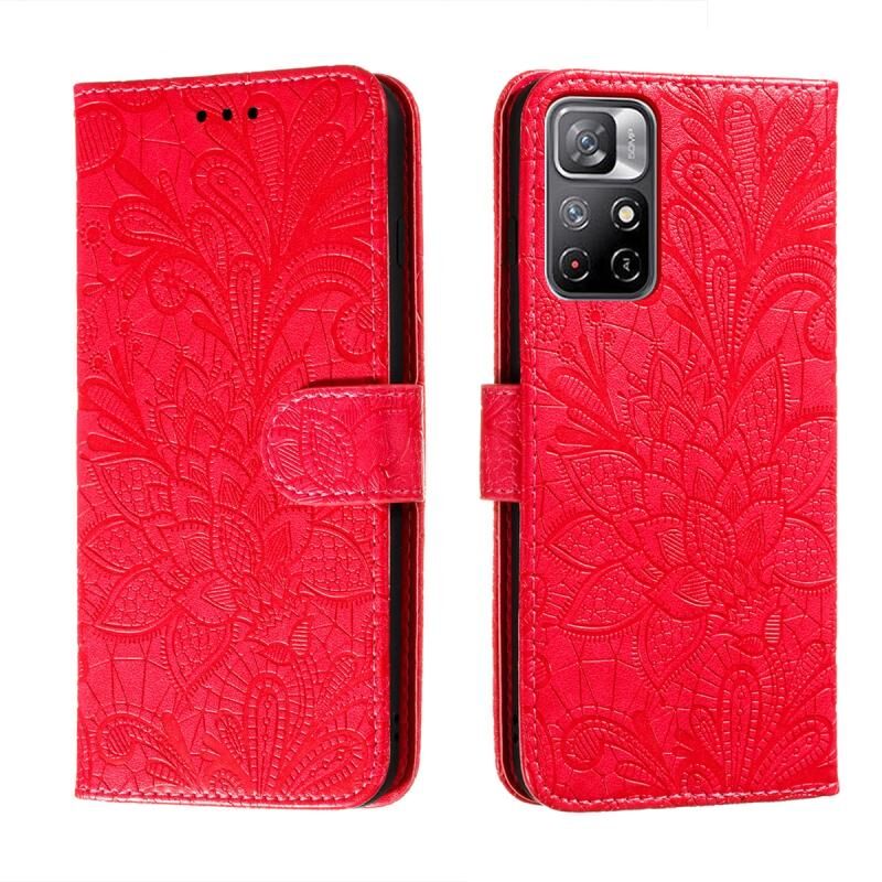 Για Xiaomi Redmi Note 11 Lace Flower Δερμάτινη θήκη τηλεφώνου με θήκη & υποδοχές για κάρτες & πορτοφόλι & κορνίζα φωτογραφιών (Κόκκινο)