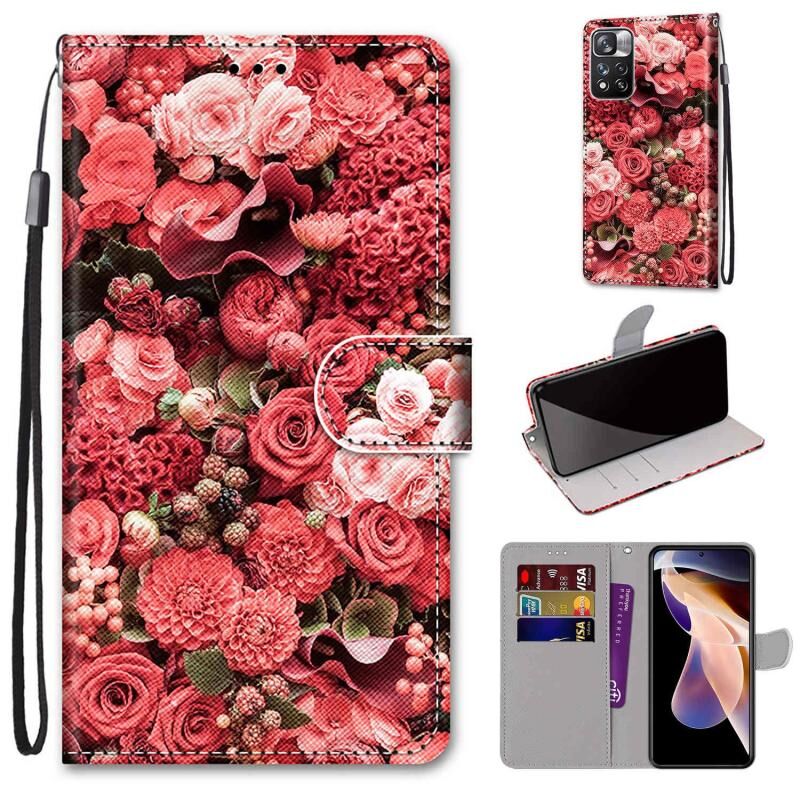 Θήκη τηλεφώνου δέρμα κατασκευής οριζόντιας αναδίπλωσης για Xiaomi Redmi Note 11 Pro/11 Pro+ με σχέδιο πολύχρωμης ζωγραφικής, ανάγλυφη υφή, βάση στήριξης, θήκες καρτών, πορτοφόλι και κορδόνι (Ροζ Λουλούδια, Γέφυρα του Πύργου).