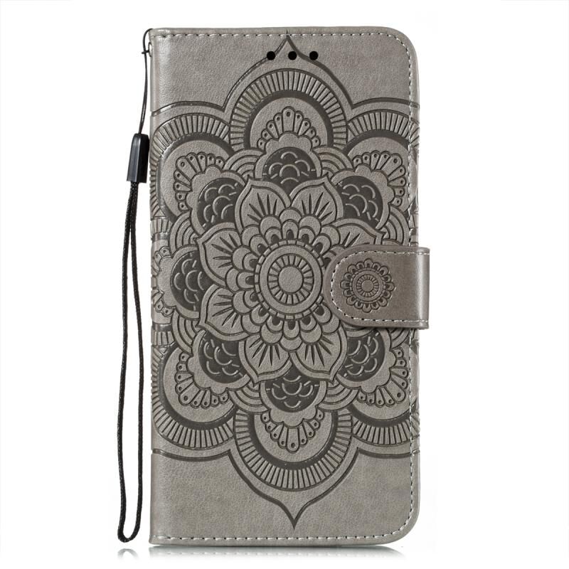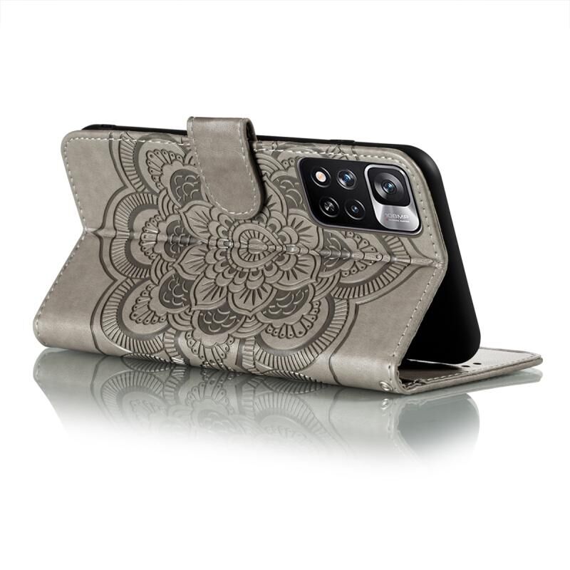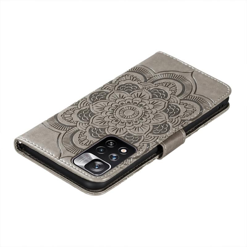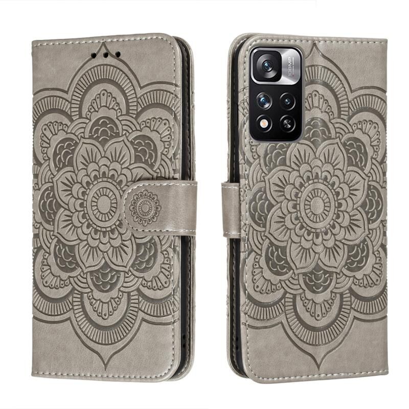 Για Xiaomi Redmi Note 11 Pro Sun Mandala ανάγλυφο μοτίβο τηλέφωνο δερμάτινη θήκη με κάτοχο & υποδοχές για κάρτες & πορτοφόλι & κορδόνι (γκρι)