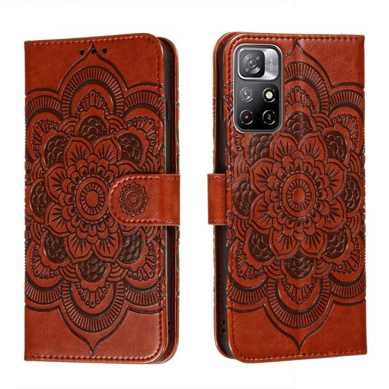 Για Xiaomi Redmi Note 11 Sun Mandala ανάγλυφο μοτίβο τηλέφωνο δερμάτινη θήκη με κάτοχο & υποδοχές για κάρτες & πορτοφόλι & κορδόνι (καφέ)